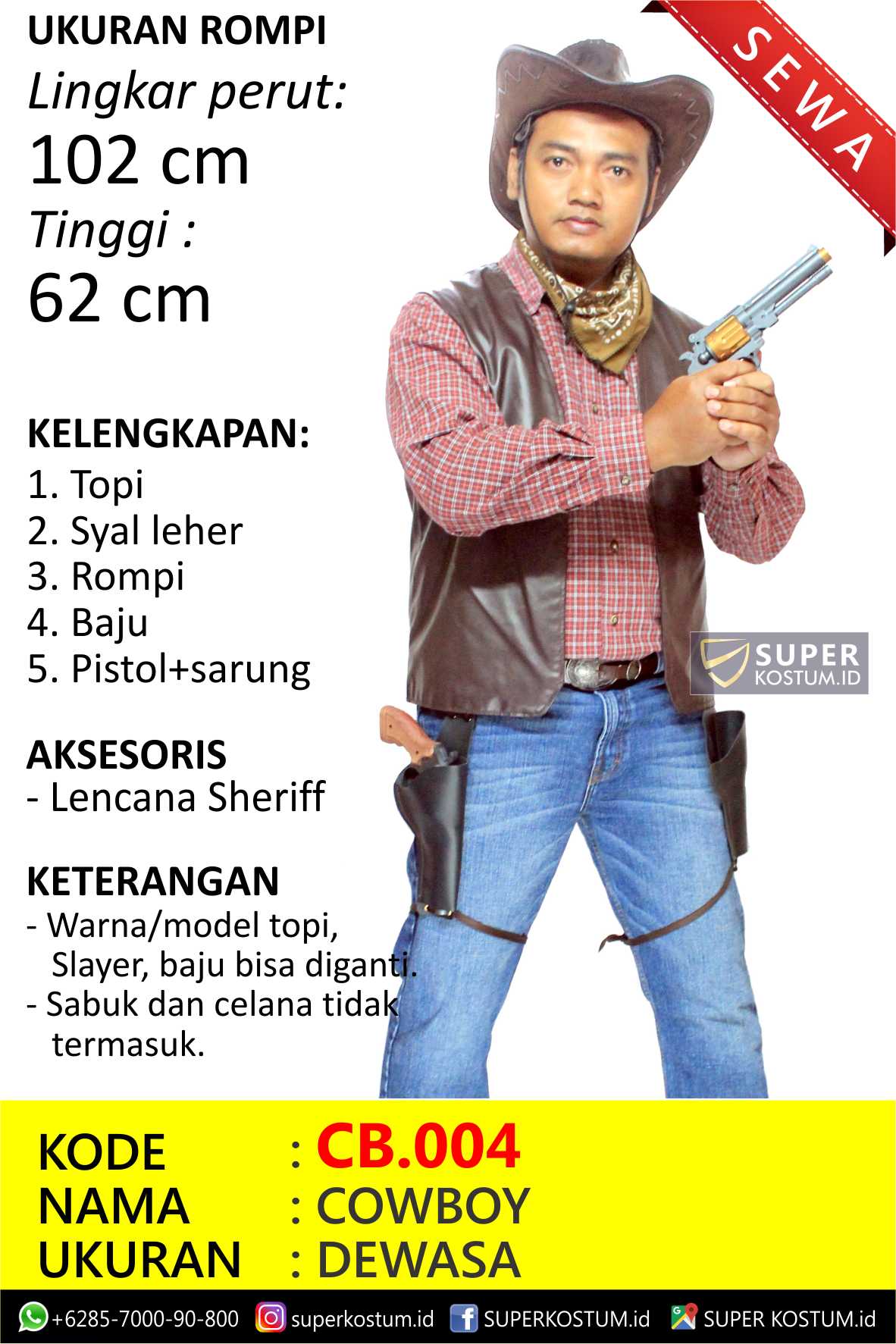 rental penyewaan sewa kostum  Cowboy Koboi pria dewasa laki-laki cowok tema baju kostum film CB.004